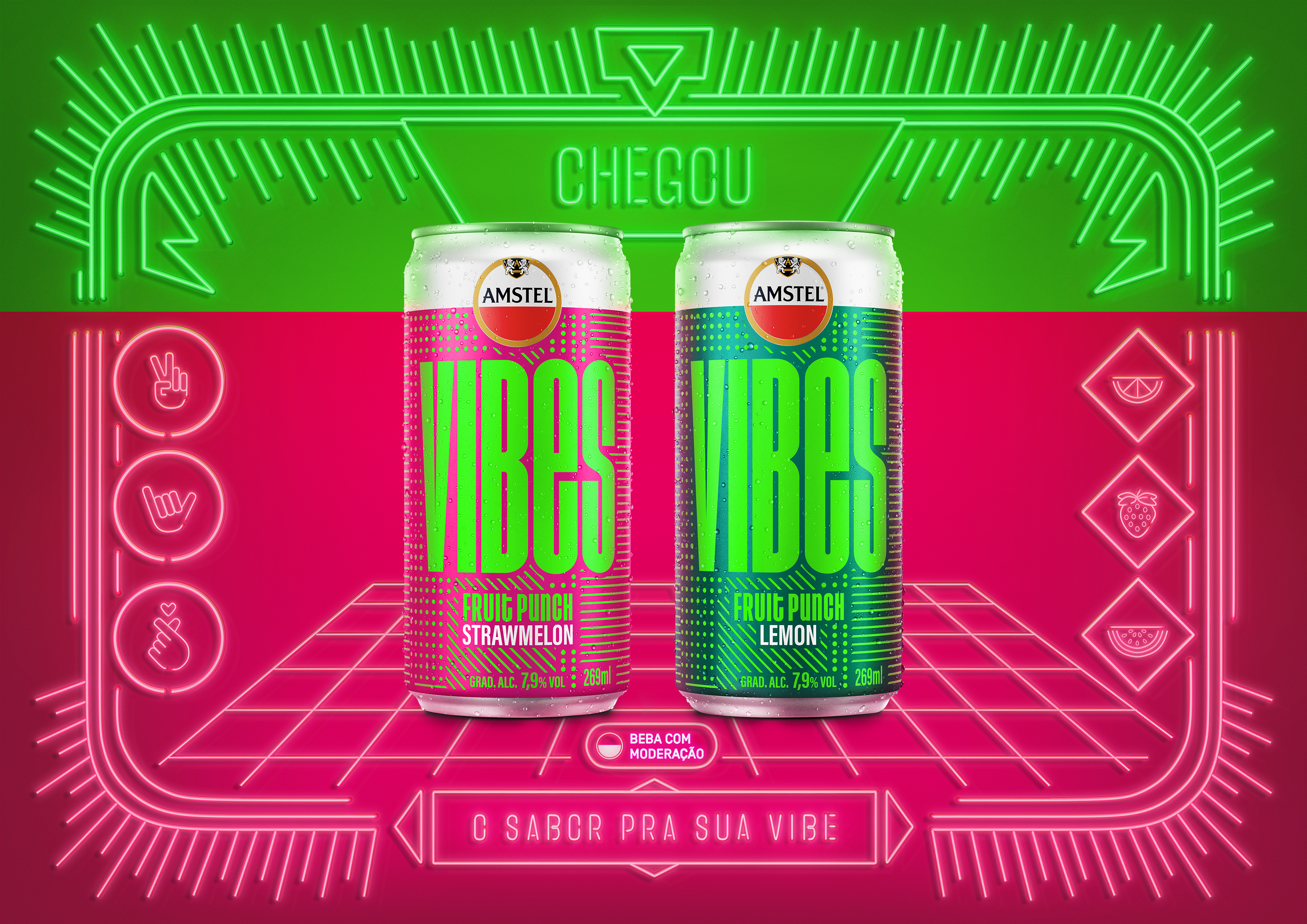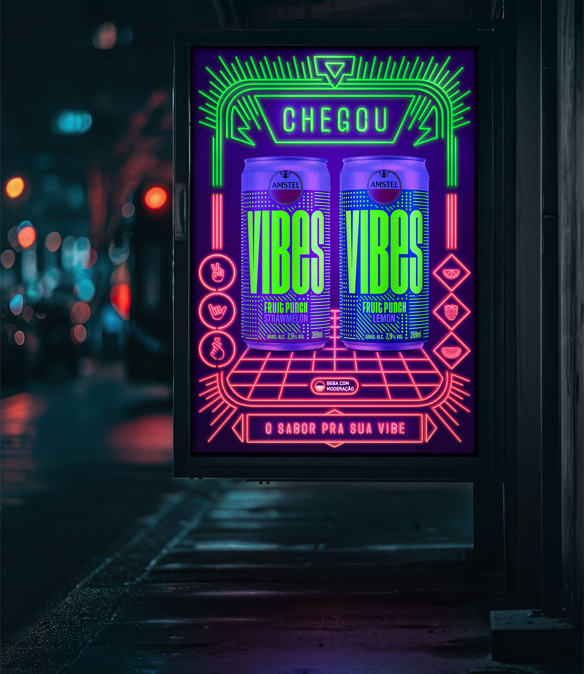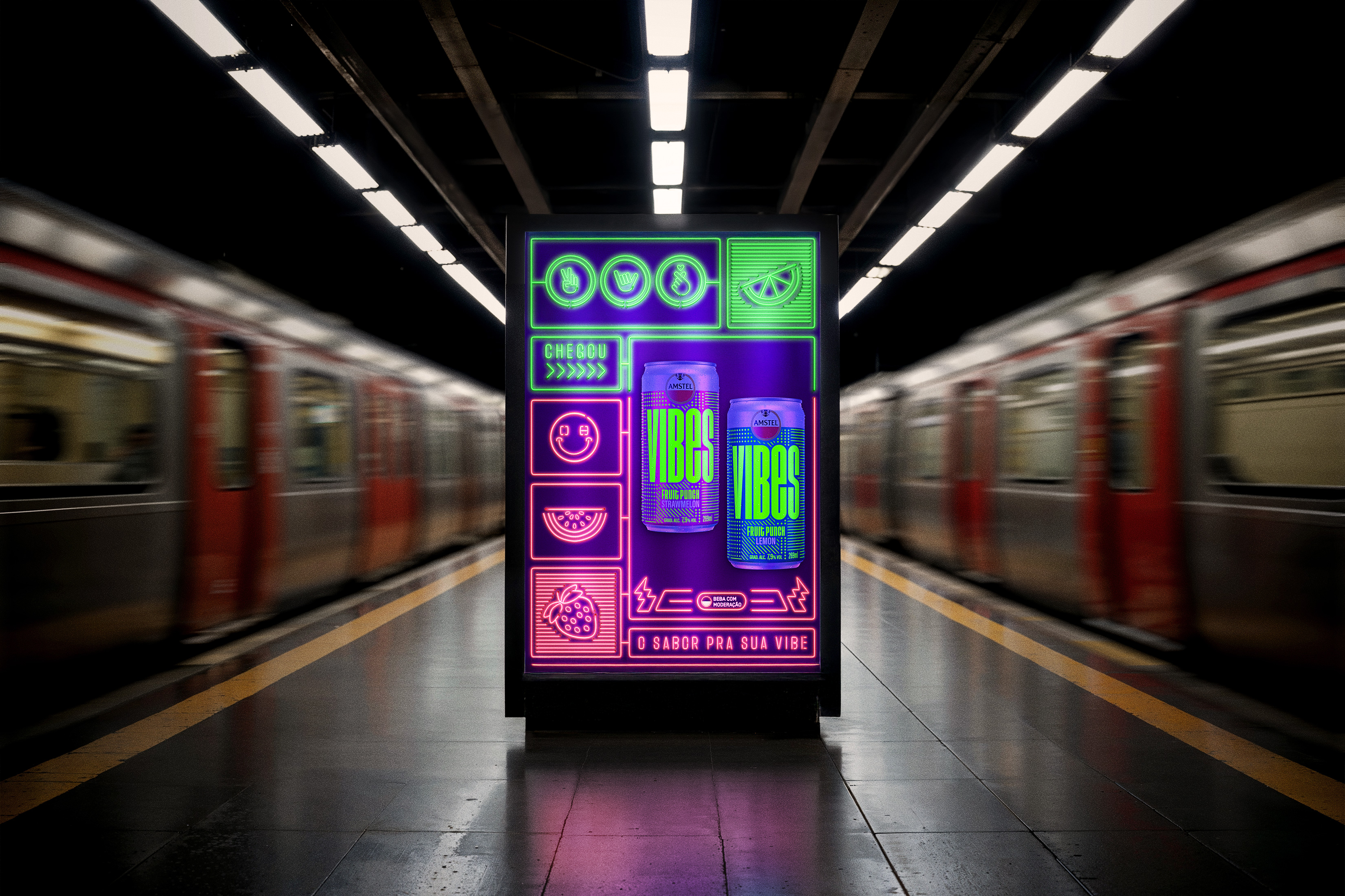 We were invited to produce images for the Amstel brand's VIBES product. A can that glows in the dark amidst a party and lights, the aim was to convey the idea that the logo would glow when exposed to neon lights.