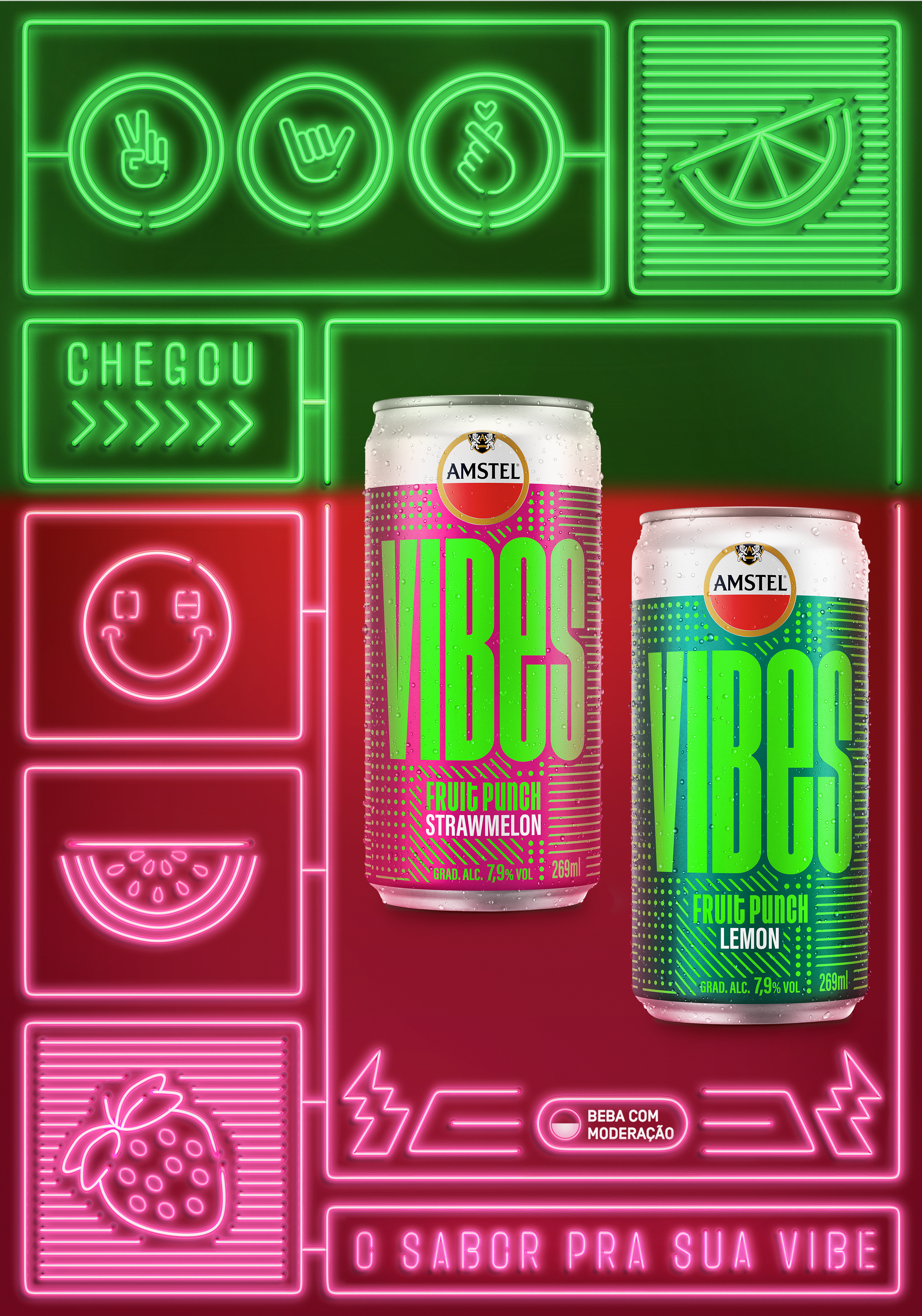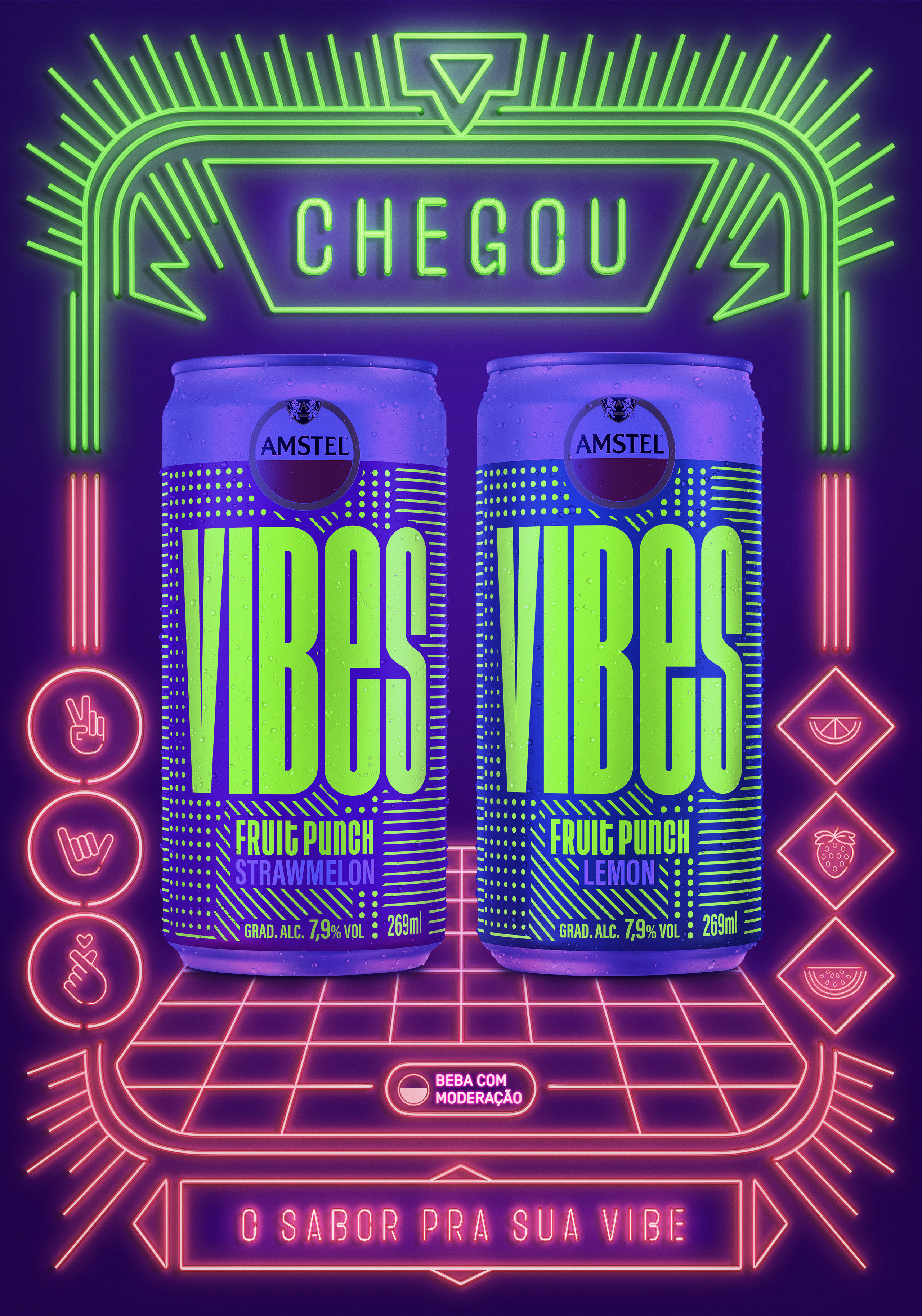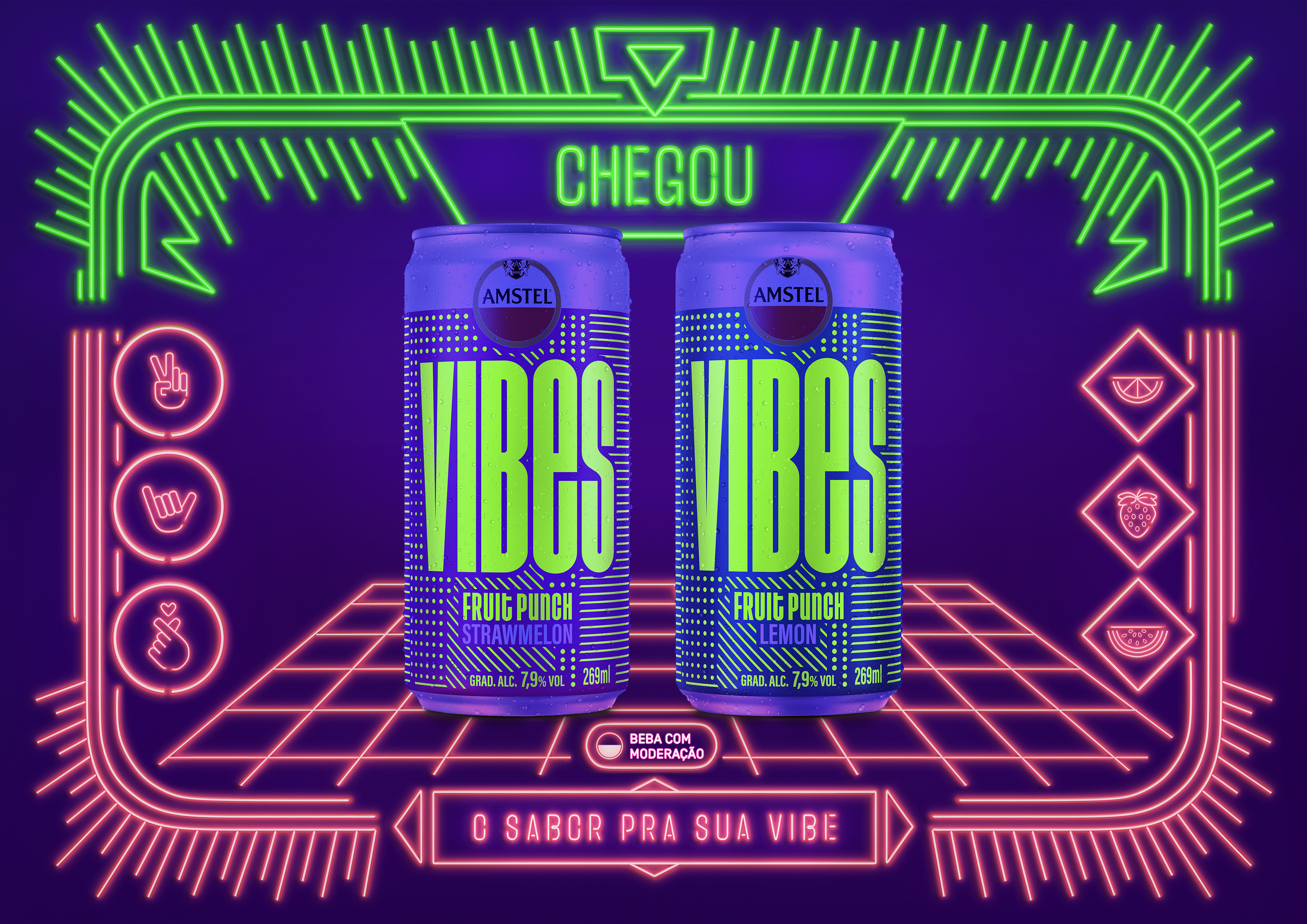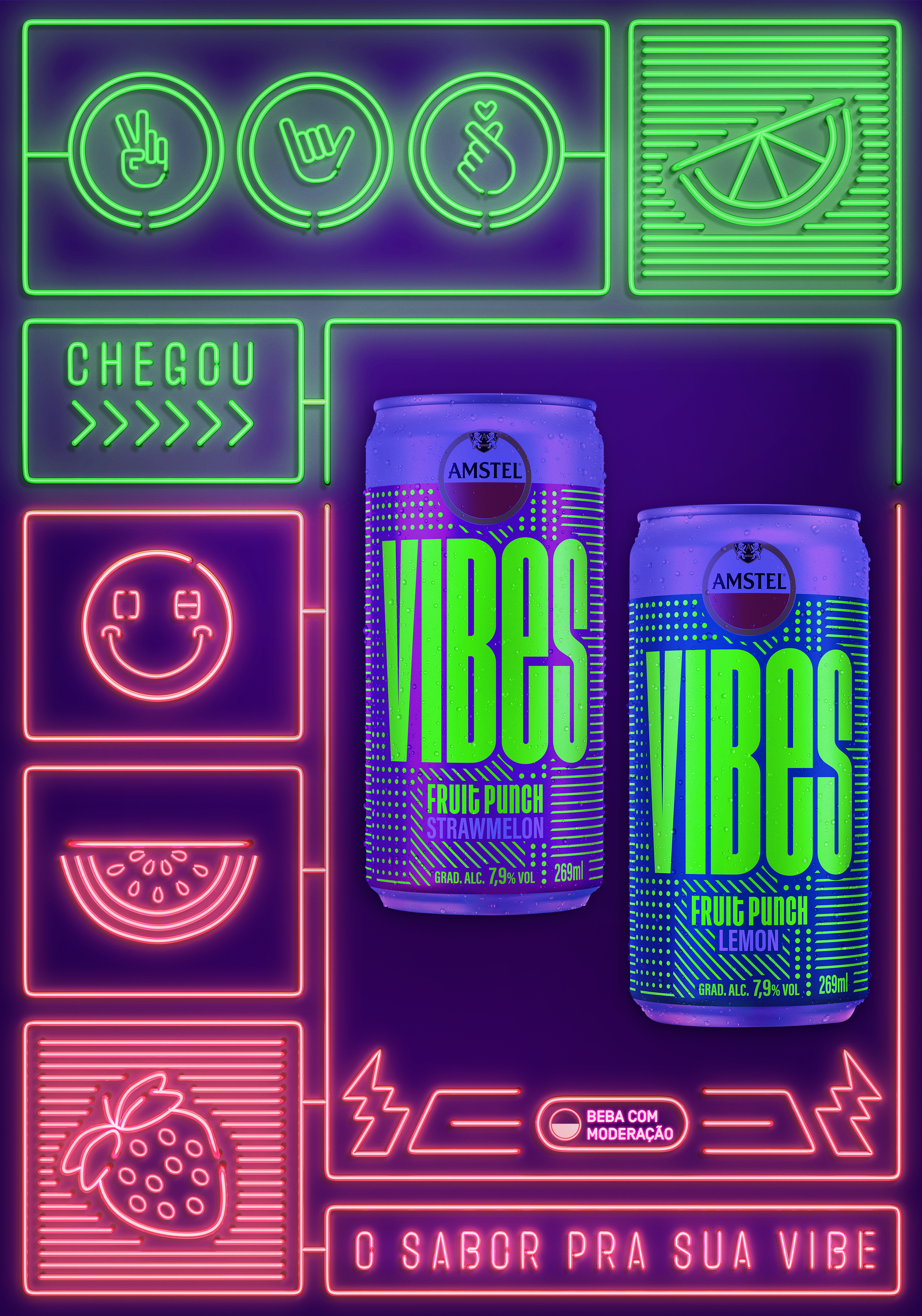 We were invited to produce images for the Amstel brand's VIBES product. A can that glows in the dark amidst a party and lights, the aim was to convey the idea that the logo would glow when exposed to neon lights.